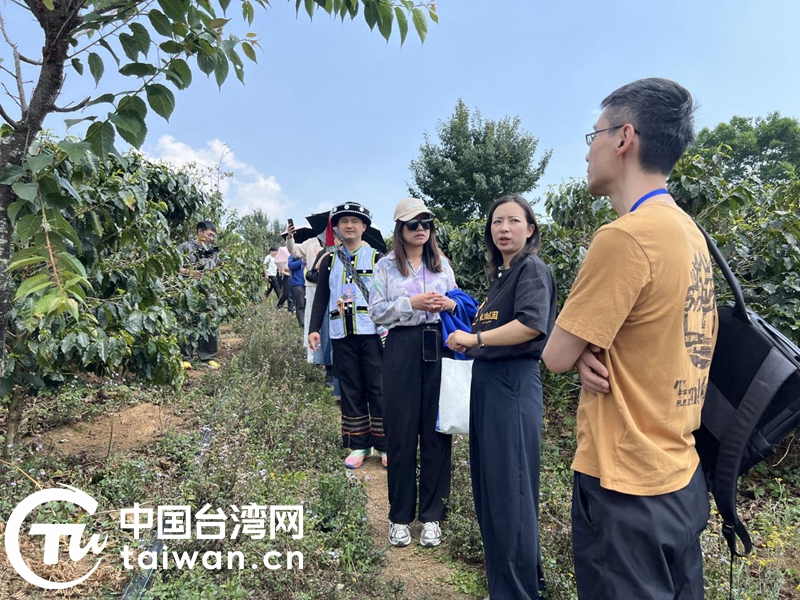 在沧源佤族自治县的咖啡种植庄园,采访团一行向庄园合伙人了解其咖啡种植、生产加工情况。(中国台湾网记者 刘琳 摄)