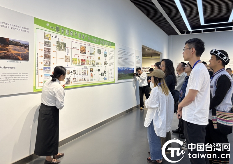 在耿马傣族佤族自治县的蔗糖文化展示中心,采访团一行聆听讲解员介绍当地“一根甘蔗吃干用尽”的甘蔗综合利用链。(中国台湾网记者 刘琳 摄)
