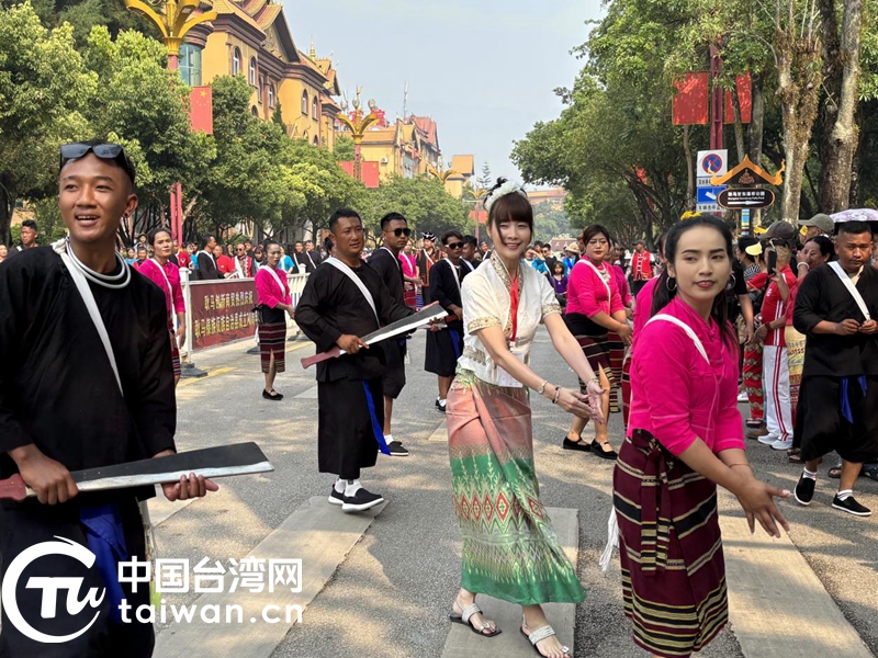 在耿马傣族佤族自治县观看民族团结方阵巡游展示时,台湾自媒体人王安琪自发加入巡游队伍,与当地民众一同迈起欢快舞步。(中国台湾网记者 刘琳 摄)