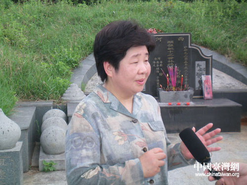 林明月在林妈宋氏祖墓前祭拜,并接受采访。(漳浦县台办陈文亮 摄)
