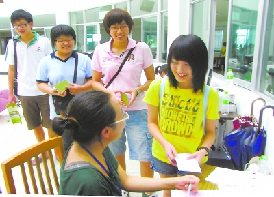 9月4日下午,在漳州天福茶学院市场营销系报到处,来自台湾的邓毓文、杨雅琍、庄宛融、林秋育四位同学,笑逐颜开地办理入学注册手续。