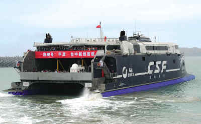 2011年11月30日上午10时,首航的“海峡号”高速客滚船驶离福建平潭澳前高速客滚码头。 刘可耕 摄(中新社发)