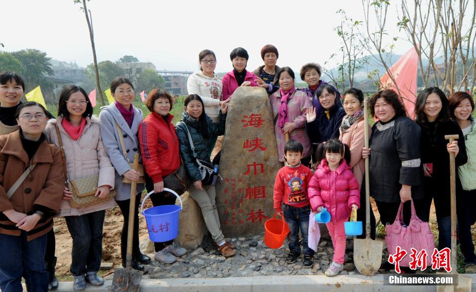 3月14日,福建省妇联、福州市妇联、福州市台联等联合组织两岸姐妹在福州闽侯县白沙镇孔元村开展“弘扬生态文明 、共建美丽家园--各界妇女共植‘海峡巾帼林’活动”,在榕机关干部、台胞台属代表、“巾帼文明岗”、优秀女性、环保文明家庭代表等海峡两岸姐妹共140人参加了该义务植树活动共同植下碧桃、红千层等树苗500多株。图为参加该植树活动的两岸姐妹在“海峡巾帼林”石碑前合影。