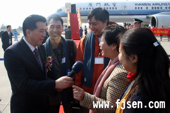 省委宣传部副部长、省政府新闻办主任朱清现场“采访”大陆首批地方媒体赴台驻点采访的记者。