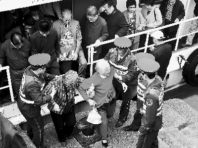 16日,湄洲岛边防官兵在搀扶前往妈祖祖庙进香的老人。近日,随着妈祖诞辰1049周年纪念日的临近,前往莆田湄洲岛妈祖祖庙进香的两岸信众骤增,每日进岛信众人数超万人,当地边防官兵全力以赴,加强海运安全,并为两岸信众提供帮助。本报记者 林熙 通讯员 孙卫锋 林剑冰 摄影报道