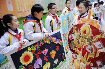 3月11日,两岸小学生展示他们亲手制作的创意族谱。新华社记者姜克红摄