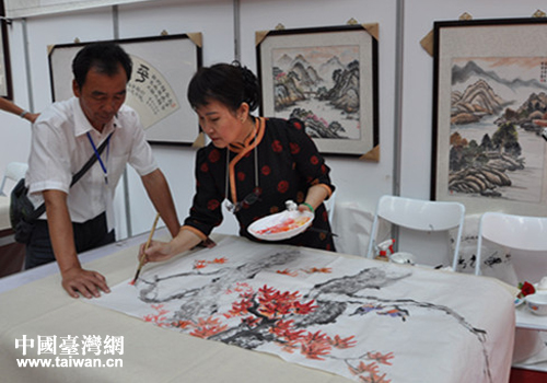 台湾著名水墨画家陈丽雀在陇台书画展现场作画。(图片来源:甘肃省台办)
