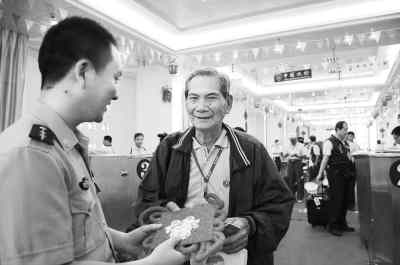 今年是妈祖诞辰1050周年,首个以整船、包船形式赴妈祖故乡朝圣的台湾进香团352名台胞,6月18日乘坐“海洋拉拉”号客轮从台湾台中港出发,于中午1时抵达福建莆田湄洲岛宫下新码头。83高龄的台胞蔡明森是352名旅客中年龄最大的,刚踏进验放通道,他就收到莆田边防检查站官兵送上的礼物——中国结。(吴志 摄)