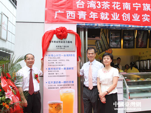中国台湾网7月19日南宁消息 7月17日,台湾3茶花南宁旗舰店开业暨广西青年就业创业实习基地挂牌仪式在南宁举行,这是共青团广西区委在台资企业设立的第一个青年就业创业实习基地,也是不久前广西自治区党委书记郭声琨率大型经贸文化代表团赴台交流后落实的第一个成果。共青团广西区委、广西青年联合会、广西台办、南宁市台办等有关部门代表及部分广西青年企业家和大学生代表出席仪式。