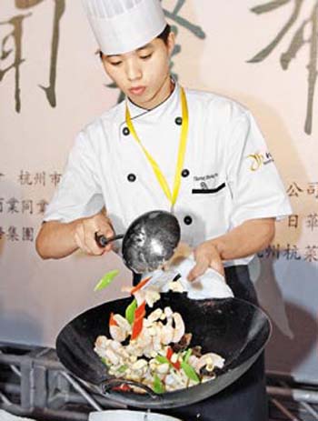 为推广杭州美食,杭州市餐饮旅店行业协会已经连续两年赴台举办“杭州-台湾美食文化节”。继去年在台北圆山饭店造成轰动之后,今年移师到台中金典酒店,原汁原味呈现,当中许多食材都是直接从杭州运到台湾,甚至连烹调的特殊食材、黄酒、茶叶等,都是原装。