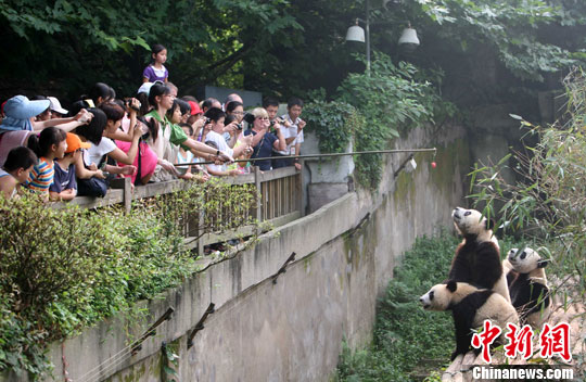 7月29日,受中共四川省委书记刘奇葆邀请,由台湾民意代表马文君率领的126名台湾“9.21”大地震灾区和“8.8”风灾灾区的学生来到成都大熊猫繁育研究基地,与大熊猫近距离接触中新社发 刘忠俊 摄