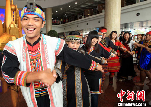 10月10日,70多位来自台湾8个少数民族的世博参访代表,在上海城市规划展示馆载歌载舞,参加上海市海峡两岸交流促进会举行的 “2010台湾少数民族世博参访团”欢迎仪式。参访团在游览上海世博会后,还将与上海大学生交流等。 中新社记者 潘索菲 摄