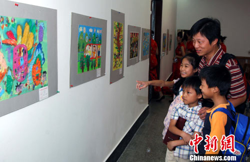 10月9日,来自台湾的小朋友正在和老师一起看画展。当日,来自台湾及福州的小朋友们在福州画院举办“亲情海峡 彩虹书画――第二届榕台小学生书画交流会”。两岸小朋友都很高兴以书画为平台,更好的交流。