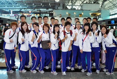 广州亚运中华台北队羽球选手8日在桃园机场搭机出发,登机前高喊加油,希望能获得更好成绩。 图片来源:“中央社”