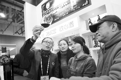 由中国商业联合会、厦门贸发局主办的首届海峡西岸中外名酒展日前在厦门举行,来自两岸三地的500个厂家参展,展品包括白酒、葡萄酒、保健酒、酒饮器皿等。图为几位台商在展会上了解葡萄酒的品质,洽谈业务。(记者 关建东 摄)