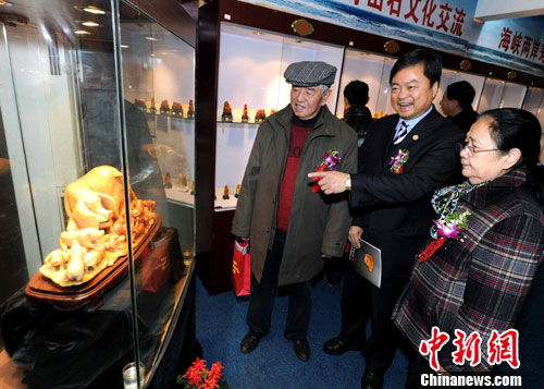 1月26日,来自海峡两岸的2000名寿山石“石友”聚首福州进行文化交流。当日,由福州海峡两岸和平统一促进会、台湾海峡两岸和平统一促进会等单位联合主办的2011海峡两岸迎新春石友联谊系列活动在福建藏天园艺术馆开幕,为期24天的活动将举办“寿山石文化交流恳谈会”、“两岸石友闹元霄”、“非物质文化传承人与石友交流”等活动。图为台湾“一国两制”研究协会会长蔡武璋(右二)与福州海峡两岸交流协会会长李纯粹(右一)等嘉宾参加该联谊活动。