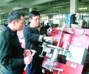 受总书记回信的鼓舞,春节以来,在漳许多台商放弃休假,带领员工投入生产。图为漳州台商协会常务副会长吕榜洲(右),与技术员在生产车间对模具设备进行技改。谢汉杰 庄兴文 摄