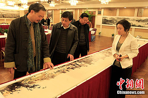 4月1日,台湾著名画家许文融(左一)在上海介绍其创作的320米水墨画《台湾风物图长卷》。其真迹将于4月22日在上海美术馆公展,届时将揭开纪念辛亥革命100周年沪台文化交流活动序幕。《台湾风物图长卷》再现了宝岛自然山川、人文建设和信仰民俗。中新社发 潘索菲 摄