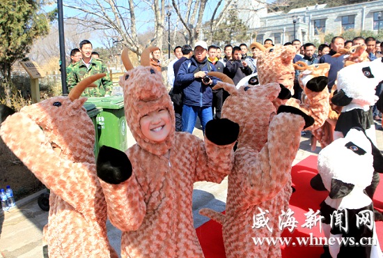 与此同时,在刘公岛国家森林公园的广场上,各有关部门负责人正在对欢迎仪式的流程进行推敲、演练,参加演出的鲸园小学的小学生们穿戴着梅花鹿、长鬃山羊、大熊猫造型的服装在现场表演,参加活动的观众也在现场列队演练。