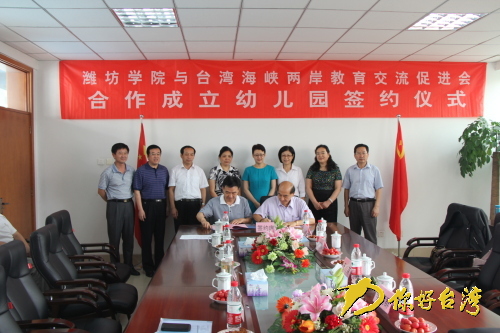 8月27日,山东省潍坊学院与台湾海峡两岸教育交流促进会合作成立幼儿园签约仪式在潍坊幼教特教师范学校隆重举行。潍坊市人民政府副市长王桂英,潍坊学院院长王守伦,市台办、市教育局领导,台湾海峡两岸教育交流促进协会理事长李超群、秘书长路蕙鸿出席签约仪式。