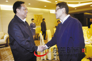 东莞市委副书记、市长李毓全(左)会见了台湾华科董事长焦佑衡(右)一行 记者 陈帆 摄