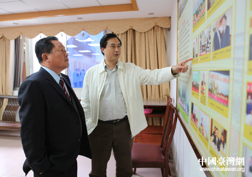 梅州市委台办主任、梅州市海峡两岸交流基地办公室主任吴寿康(右)向苗栗县县长刘政鸿介绍梅州市海峡两岸交流基地的情况。(图片来源:梅州市委台办)