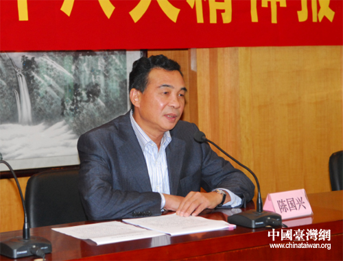 陈国兴介绍了大会概况,重点传达了胡锦涛同志代表十七届中央委员会在大会上所作的报告和习近平同志在十八届一中全会上的重要讲话精神,对大会报告中关于对台工作的重要论述作了重点阐述和解读。他强调,在两岸关系和平发展的历史新阶段,广东对台工作必须坚决贯彻落实党的十八大精神和中央对台大政方针,牢牢把握两岸关系和平发展主题,排除干扰、攻坚克难,不断巩固和深化两岸关系和平发展的政治、经济、文化和社会基础。要加快推进在粤台资企业转型升级,全面提升粤台经贸合作层次,努力实现粤台现代产业的合作对接。要深化粤台文化交流与合作,重点打造岭南文化、中山文化、客家文化、潮汕文化、三山国王文化五大文化交流品牌,增强两地文化认同。要不断扩大粤台人员往来,密切两地同胞关系,不断培植两岸同胞对中华民族的共同情感。要坚持以人为本,兑现和落实各项惠台政策措施,扎实做好为在粤台胞服务的各项工作。要加强组织领导,抓好自身队伍建设,努力构建党委统一领导、各部门密切配合、社会各界共同参与的对台工作新格局。(中国台湾网、广东省台办联合报道)