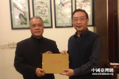 珠海市台湾事务局副局长王晓东向台湾中国新洪门党主席蔡龙绅致赠纪念品。(图片来源:珠海市台办)