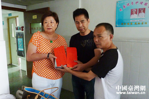 肇庆台商为患白血病患者冯月霞捐款,鼓励患者早日战胜病魔。图为刘何玉铃女士(左)、林文滨先生(中)和冯月霞丈夫(右)。(图片来源:肇庆市台办)