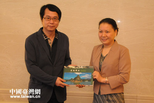 肇庆副市长陈宣群(右)向吴建宏先生致赠“美丽肇庆”画册。(图片来源:肇庆市台办)