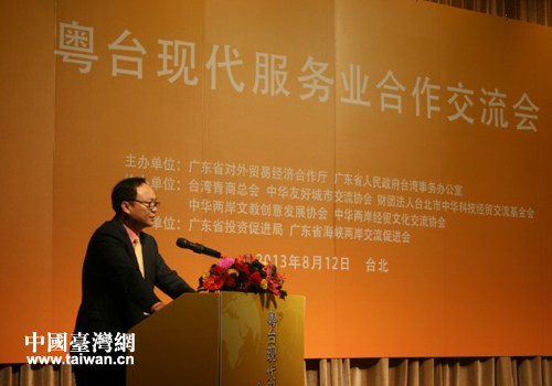 中国台湾网8月13日台北消息 8月12日下午,“粤台现代服务业合作交流会”在台北市香格里拉远东国际大饭店举办,来自广东省和台湾的商会、协会和企业共200多人参加了会议。广东省人民政府台湾事务办公室副主任陈林佐主持会议。