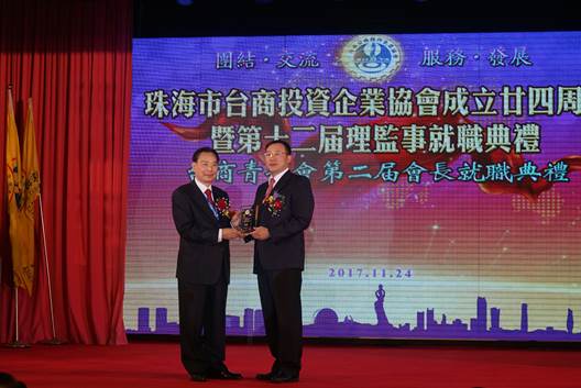 中国台湾网11月30日珠海讯 珠海台商投资企业协会2017年11月24日在珠海市度假村酒店举行协会成立24周年庆典暨第12届理监事就职典礼,第十一届会长叶飞呈连任新一届会长;前海协会会长陈云林、前海基会董事长江丙坤、澳门中联办台务部部长徐莽、海协会驻澳办主任杨流昌、广东省台办副主任方涛、市委常委统战部部长郭才武等领导和嘉宾近700人出席了庆典活动。