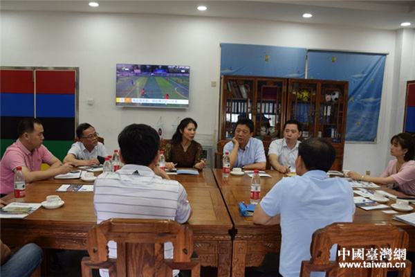 当天上午,调研组一行来到新会区体育中心参观,并实地考察了广东珠超联赛有限公司,与广东珠超联赛有限公司董事长黄达昌及珠超台湾球队主教练张展维围绕如何创建“广东省海峡两岸青少年交流基地”进行了深入座谈交流。刘小青表示,海峡两岸交流基地适应两岸大开放、大交流的新形势要求,突出两岸交流地方特色,是深化两岸经贸文化交流合作的新平台。江台两地五人制足球领域交流已具备相当基础,希望江门能把握资源优势,利用珠超俱乐部平台,发扬江台两地五人足球文化,共促两地青少年交流合作,让“两岸一家亲”理念深入人心。谭健文表示,非常感谢省台办对江门对台工作的关心与支持,江门市台办将贯彻落实省台办工作要求,凭借珠超联赛的实力基础,打造江台两地青少年交流平台,努力争创“广东省海峡两岸青少年交流基地”,扩大江门对台品牌的吸引力和影响力。