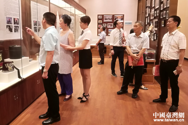 台胞徐燕女士(左中)与儿子霍伟强(右三)在广州市台协会长王治中(右二)、花都区台协会长童祖耀(右一)陪同下参观校史馆和其父徐亨事迹陈列室。(图片来源:广州市花都区台办)