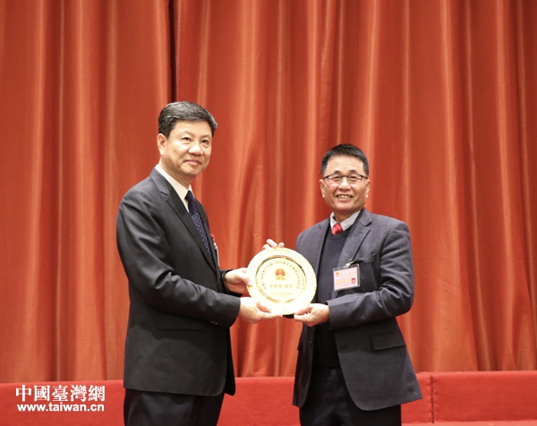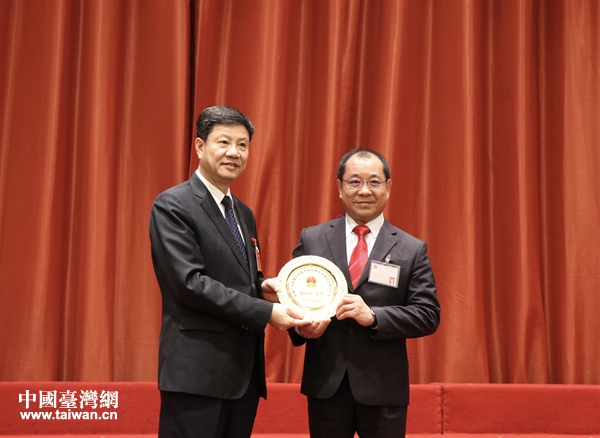 陈建华(图左)向广州市第十五批荣誉市民王治中(图右)颁发纪念碑。(图片来源:广州市台办)