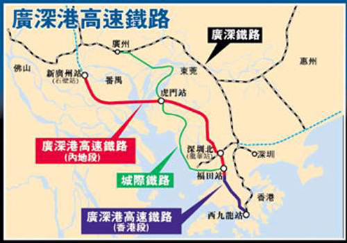目前广深港铁路广州至深圳正在兴建当中,预计于明年完工。对于被指香港工程的建设速度比内地滞后,港府消息人士解释,由于2004至2005年时,有关方面讨论研究铁路运用共享信道或专用信道,花费较长时间。其后,中央政府于2007年时,确立建设3.4米宽的专用通道,港府才敲定建设轨道所用方案。