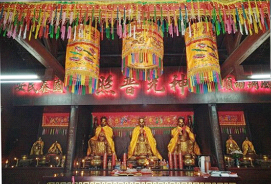 公王殿内的神坛上供奉着三尊称为“三山国王”的塑像,他们都是农民武士的装束打扮。居中的是大哥巾山,左手握著帅印,右手提著宝剑;左尊是二哥明山,手执方天画戟;右尊是三哥独山,也是手执方天画戟。三尊神像,他们的坐骑都是老虎。老虎的神威加上国王的威武气概,让人感受到森严,不觉肃然起敬。