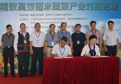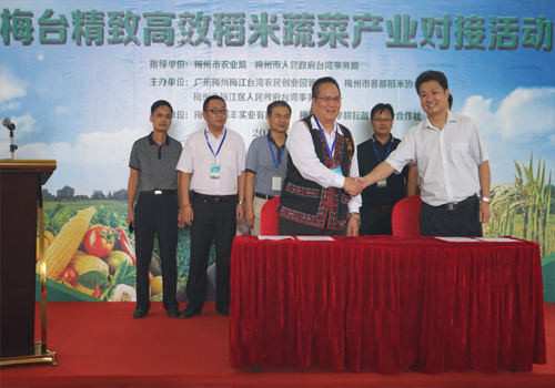 在当日上午举行的“梅台精致高效稻米蔬菜产业对接活动”中,梅州市稻丰实业有限公司与台湾中华生机农业文化经贸交流协会签订梅台精致高效稻米产业项目合作意向书,梅州市四季耕耘蔬果专业合作社与台湾福斯特生物科技有限公司签订梅台精致高效蔬菜产业项目合作意向书,梅州市客都稻米协会聘请中华生机农业文化经贸交流协会理事长巴湃·拉拉格狮先生为农业发展顾问,梅州市四季耕耘蔬果专业合作社聘请台湾福斯特生物科技有限公司总经理林美珍女士为台湾种子、农机具引进及农产品深加工顾问。