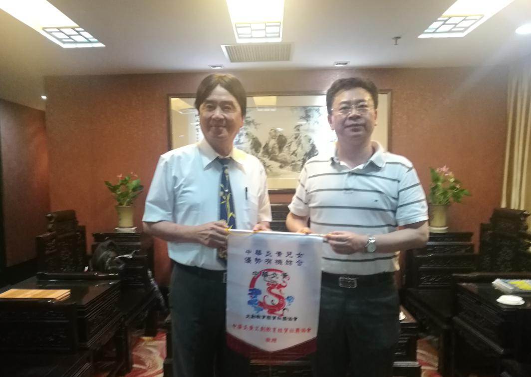 省台办副主任侯振富(右)与台湾中华炎黄文创教育经贸社团协会理事长、台湾同乡会理事长联谊总会召集人、高雄广东同乡会原理事长魏国伟交换会旗