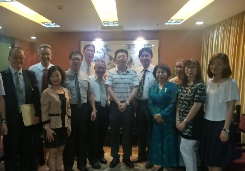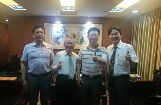 省台办副主任侯振富(右二)、台湾中华炎黄文创教育经贸社团协会理事长、台湾同乡会理事长联谊总会召集人、高雄广东同乡会原理事长魏国伟(右一)、台湾中华炎黄文创教育经贸社团协会副理事长、台北市丰顺同乡会理事长丁叔君(左二)合影