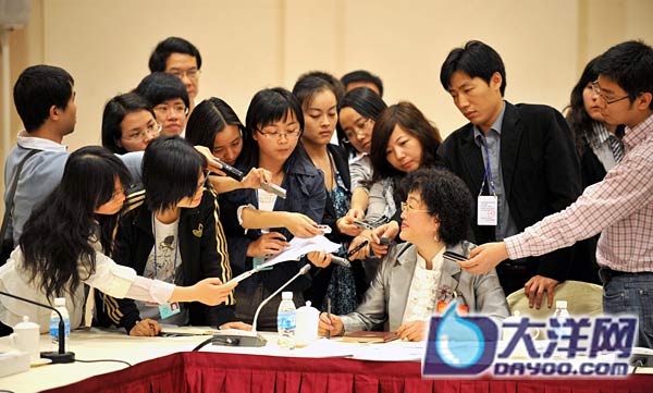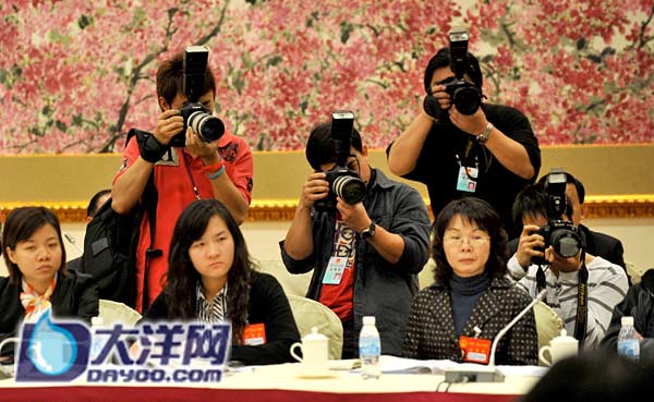 几名摄影记者不约而同站在同一个角度拍摄代表发言。