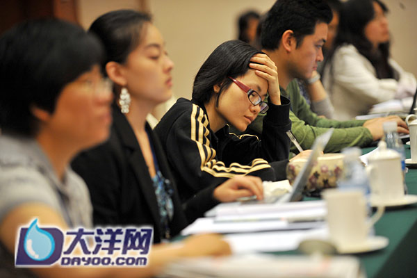 一位在台下做笔记的女记者在代表发言间隙抱头小歇片刻。