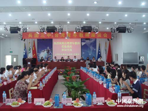 台湾青年教师参访团与新疆兵团三中教师交流座谈。(图片来源:新疆生产建设兵团台办)