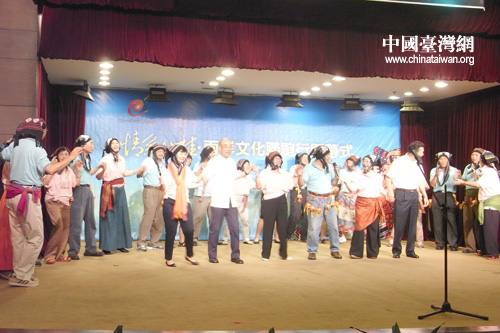 这时全体演出人员走下台来,所有参加“情系八桂”的两岸文化界人士和工作人员手拉手,共同高唱,顿时会场变成了一片欢乐的海洋。(中国台湾网 芜同)