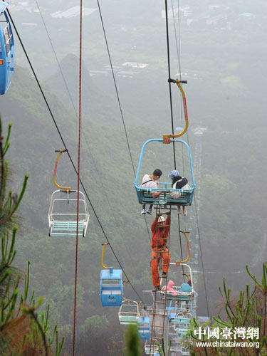 中国台湾网6月1日桂林消息 5月26日,广西桂林,大雨低温。当天上午,桂林尧山观光缆车因机械故障停止运行,78名游客被困1400米段长的高空缆车,其中有22名台湾游客。