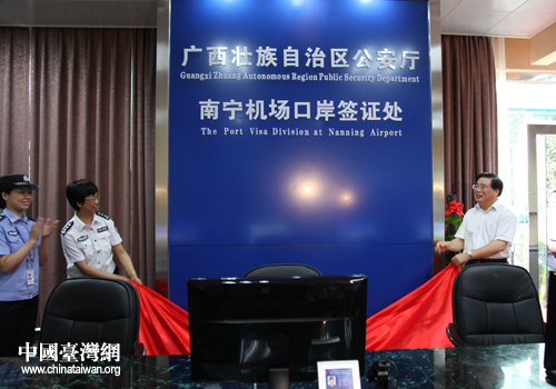中国台湾网6月26日南宁消息 日前,台湾居民口岸签注启动暨广西壮族自治区公安厅南宁机场口岸签证处揭牌仪式在南宁吴圩国际机场隆重举行。广西壮族自治区副主席、公安厅党委书记、厅长梁胜利,公安部出入境管理局副局长朱际青等领导出席并致词。自治区、南宁市有关部门领导,部分在邕旅行社代表,公安民警代表共250人参加了启动仪式。