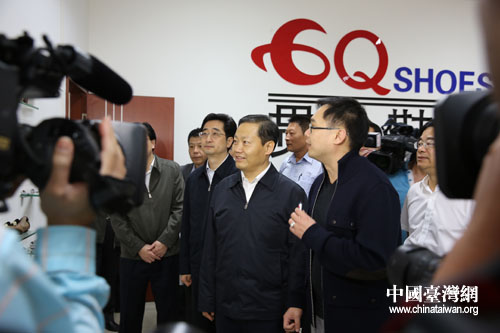 广西壮族自治区党委书记彭清华(右二)走访台资企业广西广西贯铨鞋业。(图片来源:广西台办)
