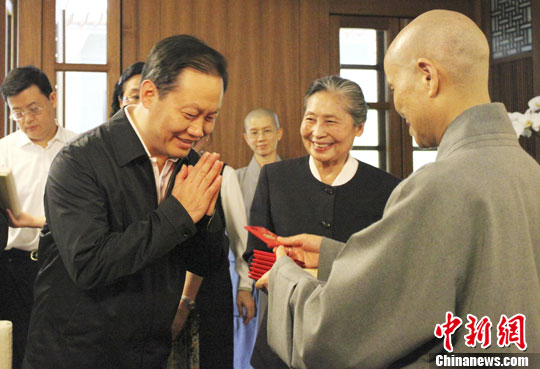 4月24日,佛教高僧证严法师在台湾花莲会见访台的中共广西壮族自治区委员会书记彭清华一行。图为证严法师向彭清华赠送福慧红包。中新社发 周群 摄