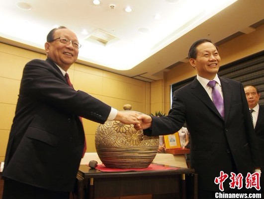 蒋孝严赠送彭清华莺歌陶瓷“聚宝瓮”,意寓为广西发展“聚宝”。彭清华则回赠蒋孝严广西钦州坭兴陶。(完)