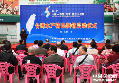 中国台湾网10月21日南宁消息 10月19日上午,台湾水产精品展销专区启动仪式在广西水产畜牧业名特优产品展销展示中心的小广场隆重举行。国台办、广西台办、台湾渔会参访团、广西水产畜牧兽医局、各市水产畜牧兽医局及直属单位、广西大学动物科技学院、广西渔业龙头企业、新闻媒体等260人参加了启动仪式。